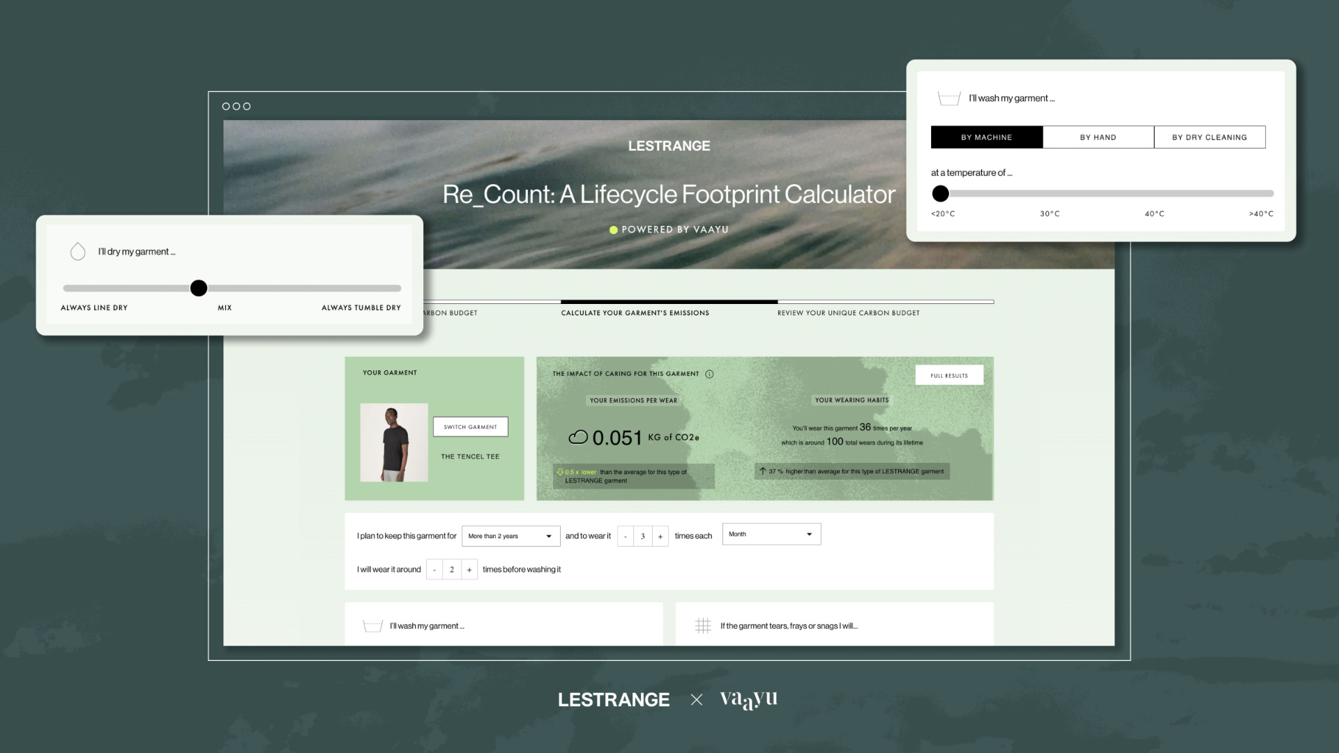 Will Green, Co-Founder of LESTRANGE adds: “Bringing the fashion industry’s footprint inside planetary boundaries will only happen by considering every phase of a product’s life cycle. With Re_Count we’re bringing to market a first of its kind approach to empower and hopefully inspire customers to make more intentional decisions with the way they use and care for their clothes – and crucially – giving people context for how their decisions ladder back to wider science based targets – or their own carbon budget – all in an easy to explore calculator.