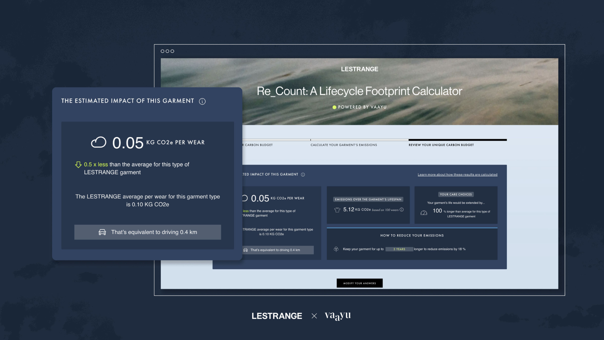 On a mission to empower customers to reduce their climate impact, London-based menswear brand LESTRANGE and climate-tech start-up Vaayu have pioneered the first automated, science-based life cycle calculator, Re_Count, to help customers see how their fashion habits impact their environmental footprint.