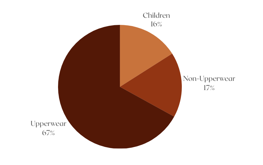 Additionally, it is important to note that not all overproduction is created equally. Apparel is roughly split up in three categories; children’s garments, non-upperwear (underwear, socks, ties, tights, etc.), and upperwear (shirts, trousers, dresses, coats etc.).