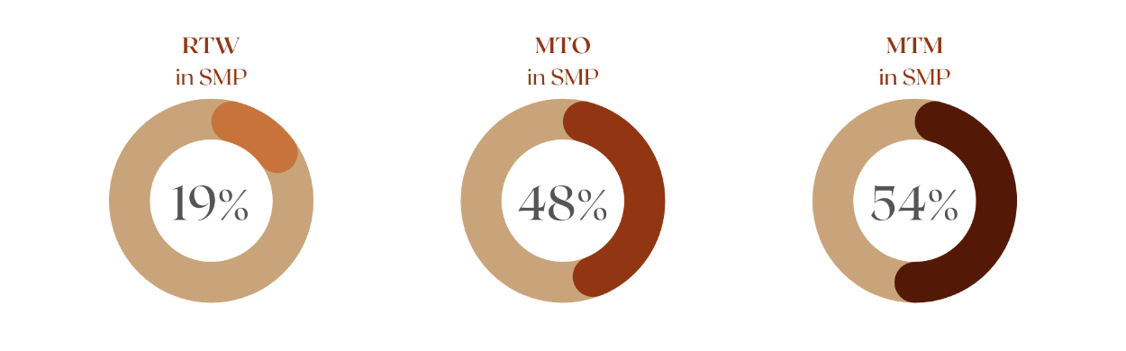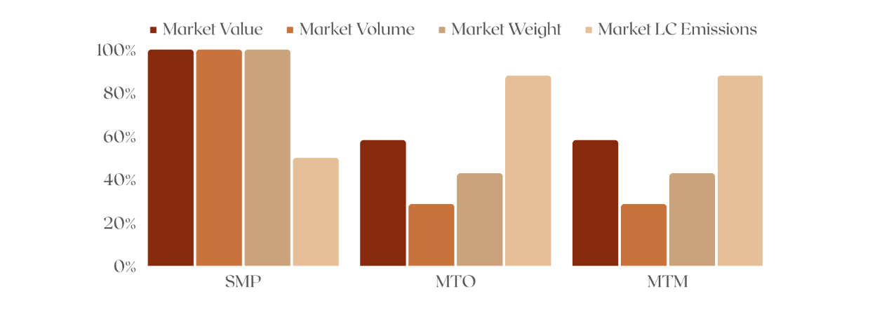 SMP theoretically affects 100% of revenue, volume and weight. MTO and MTM affect 59% of the market value, 29% of its volume and 33% of its total weight. SMP affects the production phase (44% of the emissions throughout the garment’s life cycle). Whereas MTO and MTM lower the number of garments produced, the number of garments distributed and the number of garments incinerated or landfilled, thereby affecting 83% of the garment’s life cycle emissions.