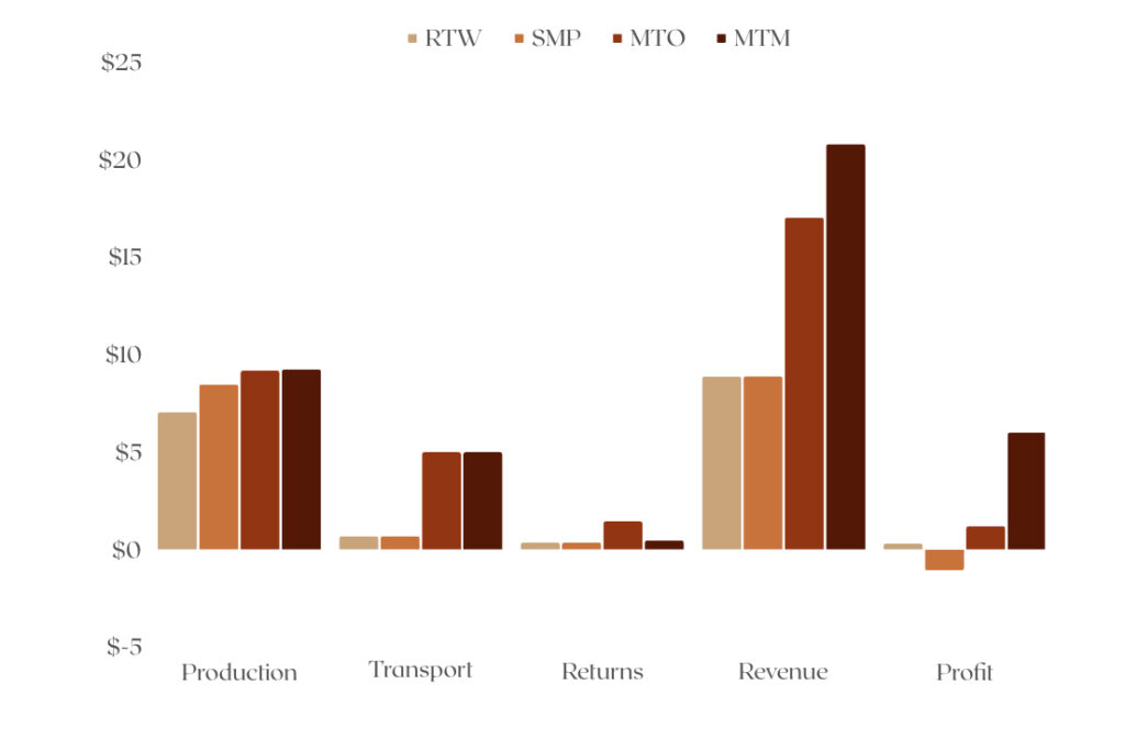 With respect to offshored RTW production in a regular material, SMP production costs are 20% higher, but at identical price points, this cost increase is not offset by higher revenue, resulting in a negative gross margin of -12% for SMP. Even though MTO and MTM production costs are 30%-31% higher than RTW, and the transport costs are seven times higher than for RTW, these cost increases are offset by the revenue increases, resulting in gross margins of 7% for MTO and 29% for MTM. These higher margins can be explained through a higher sell through rate, and the fact that all MTO and MTM sales are at full price.