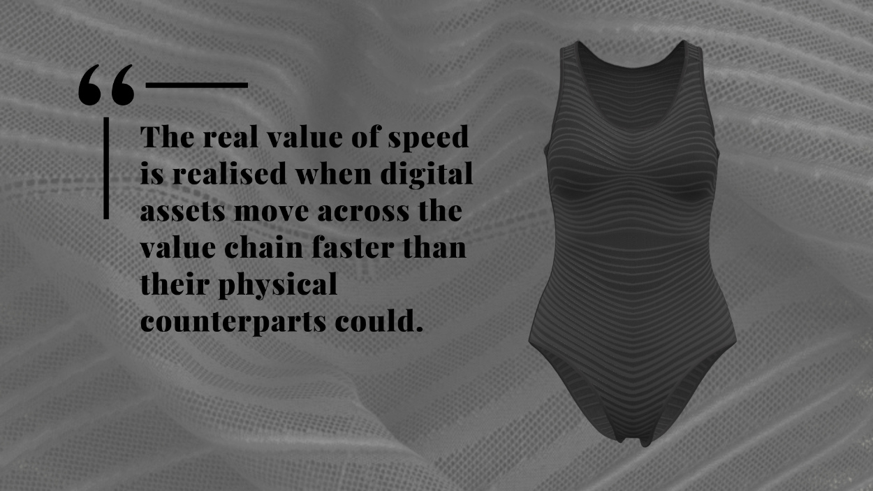 The real value of speed is realised when digital assets move across the value chain faster than their physical counterparts could. So while a lot of brand strategies have been focused on beginning DPC from garment creation, why not explore what can be done at the fabric stage, by the teams that are directly working on material development? The capabilities are still developing, but the potential for transformative improvements is real.