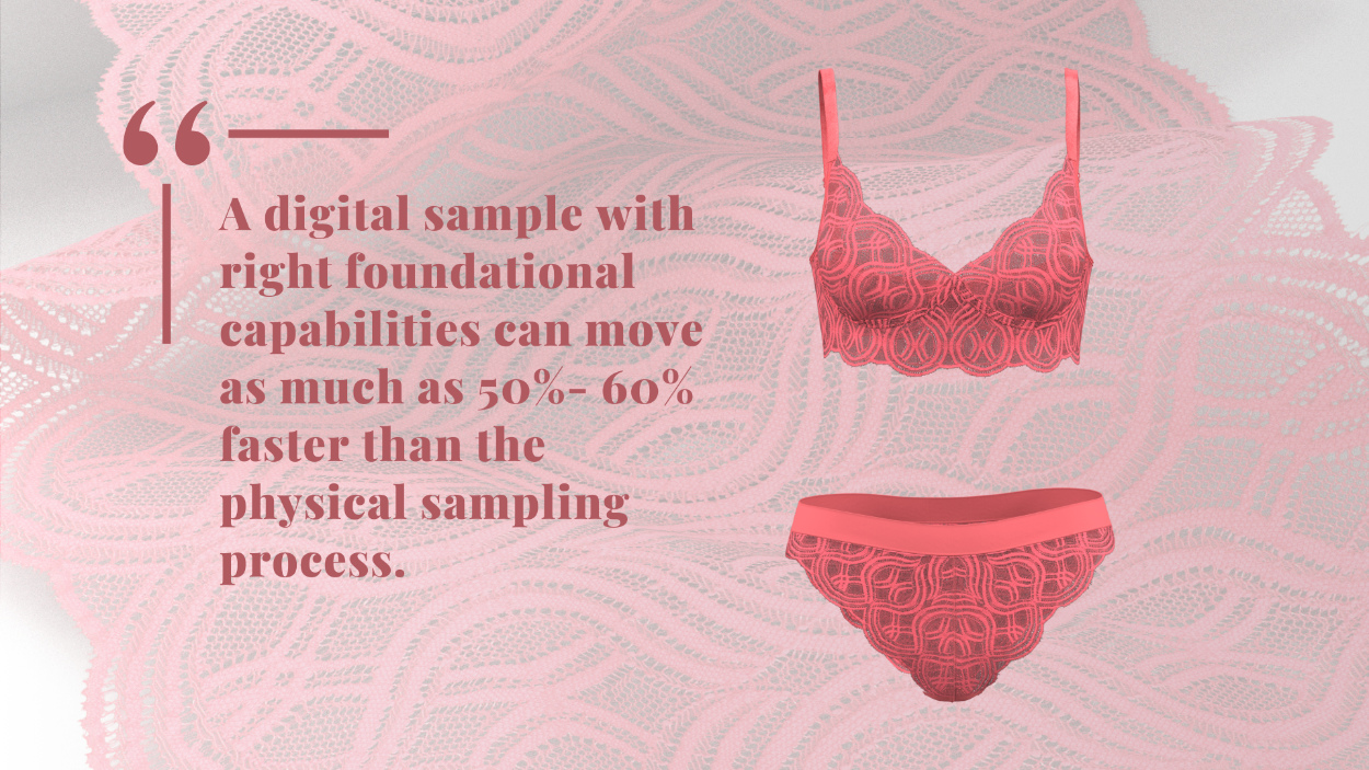 A digital sample with right foundational capabilities can move as much as 50%- 60% faster than the physical sampling process. But this level of speed cannot be unlocked through just one or two rounds of sampling. At times, the first round of Digital Twin (DT) might actually be slower than physical sampling considering the effort that needs to be front-loaded, such as material digitization & 3D garment creation. So where do those time savings actually come from? As the DT moves across the value chain, the work put in at the earliest stages (by suppliers and by their brand customers) has compounded benefits, and the incremental effort is comparatively less. A DT follows an additive process, whereas a physical sample is built all over again at every sampling need. As the need for digital sampling grows, the speed of the overall workflow can pick up drastically.