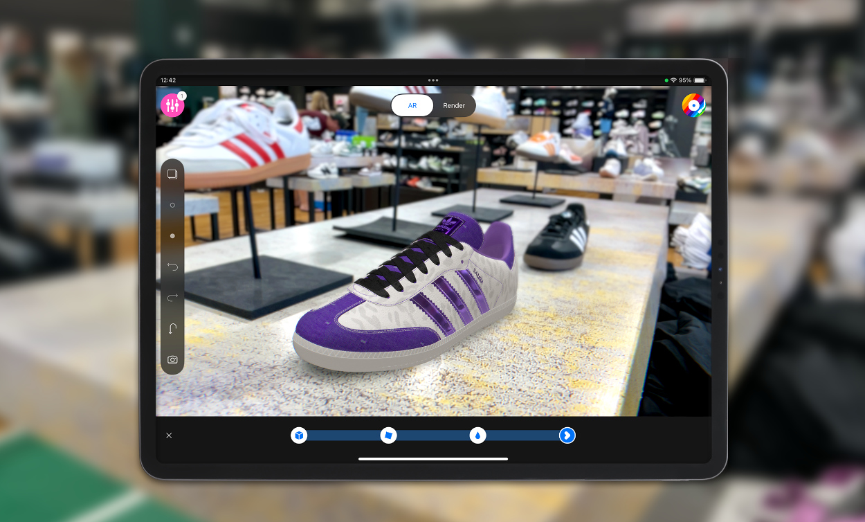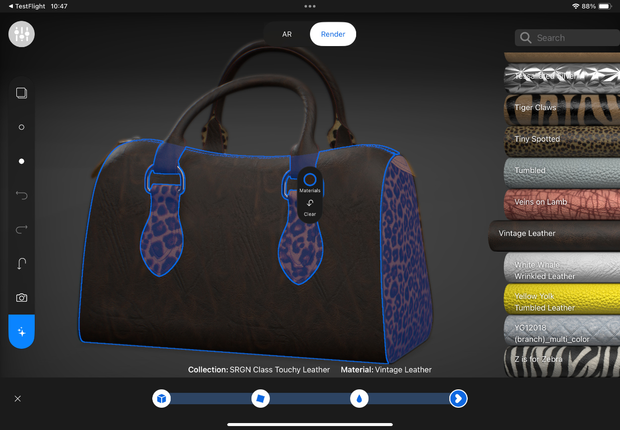 What is mix? mix is the first interactive 3D design and visualization application with a built in ML engine, powered by the magic of touch. Tapping into the swatchbook cloud backbone, designers have thousands of materials and colors at their fingertips to create designs of their 3D models with a few simple clicks, through the machine, or in a combination of both. No shader tweaking, only beautifully digitized materials and colors that can be applied directly to one or many parts of the 3D object, with the beauty of recoloring to create your own, unique creations of new designs based on your own seasonal color palette. Since you are using a mobile device you can choose to design and visualize the model in realtime render mode or in AR. Once finished, a simple push of a button will save your designs in the swatchbook cloud, create photographic content of your design along with a detailed virtual Bill of Materials (vBoM), all generated automatically and available to be shared with the design team, factories or retail. It’s like magic!