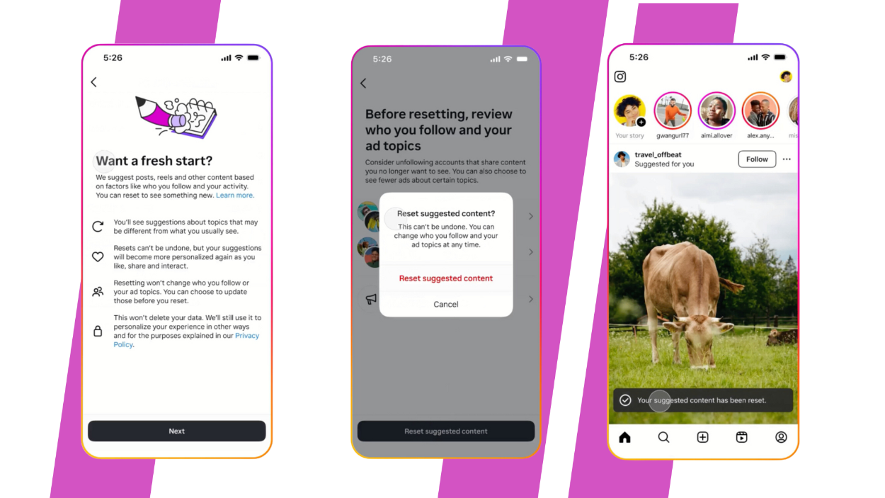 Instagram, for instance, this week announced that it is testing a way for people to “reset the content recommendations they see in Explore, Reels and Feed when they want a fresh start.” Recommendations will then start to personalise again over time, showing new content based on the content and accounts you interact with. When resetting, users also have the option to review the accounts they follow and unfollow any that share content they no longer want to see.