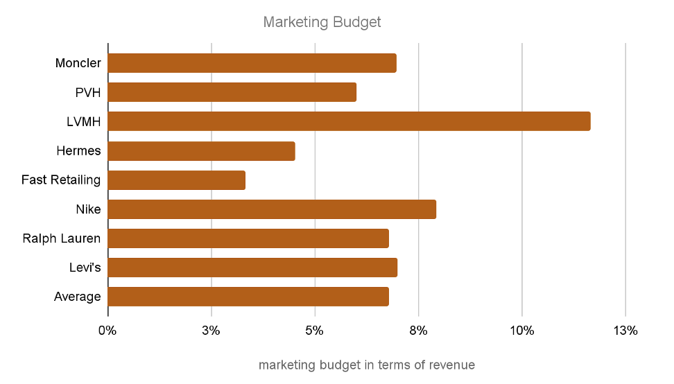 *Marketing budget in this case often refers to ads expenditure, although it is not singularly defined so in (annual) reports. LVMH ad expenditures, for example, are estimated around 10.5 billion euros. As per their own annual report, marketing and selling expenditures are 36% of revenue.