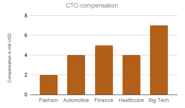 CTO salaries (not unsurprisingly) are highest in big tech companies. But they’re also higher in automotive, healthcare, and finance.