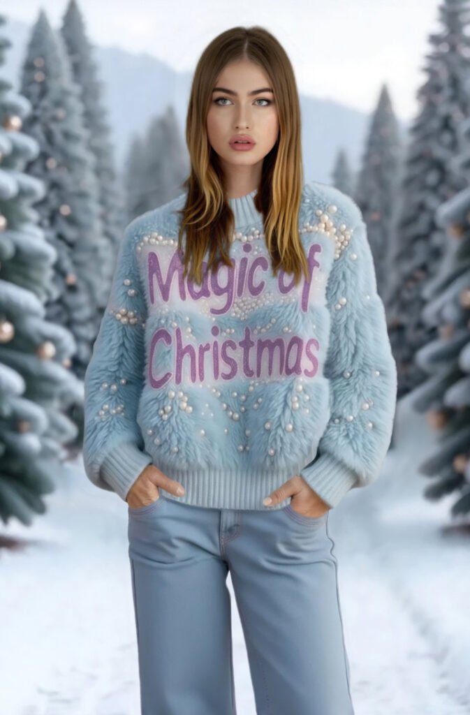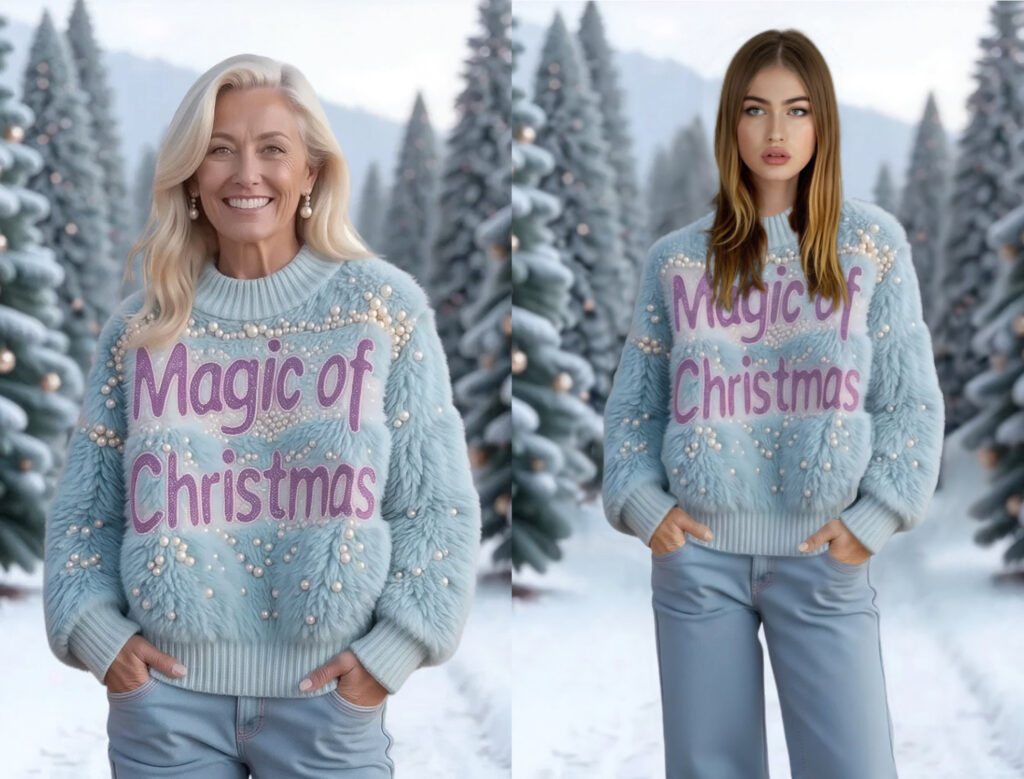 The origin of the Christmas Jumper tradition can be traced back to 19th century Scandinavia where thick warm and brightly coloured jumpers were worn to escape from the cold. More recently, Statista reported that on average 47% of consumers worldwide enjoy ugly Christmas jumpers.   However, that is not what motivated this project. Zyler collaborated with Zenaida after being made aware of the shocking stats of the overconsumption of Christmas jumpers. True Origin reports that 12 million jumpers are purchased each year in the UK alone and one quarter of those are only worn once.  Research by environmental charity Hubbub found that 95% of jumpers are made completely, or considerably from synthetic materials. Generally they are acrylic, and this means that they take over 200 years to decompose. Zyler’s innovation consultant and digital fashion expert Karinna Grant who led this project explains: “We think this is a fun use of AI tech, combining VTO and digital fashion to offer consumers an alternative way to participate in this phenomenon. We do also acknowledge that these technologies have an environmental footprint, however we believe that responsible use of AI and digital design considerably outweighs the negative impact of overproduction and discardment of physical clothing.”