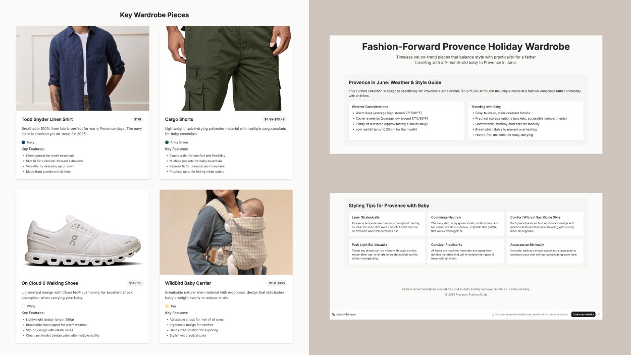 Browser Use is one of the agents powering Manus, the AI agent platform from Chinese startup Butterfly Effect. Fittingly – or perhaps inevitably, given the name – Browser Use went viral alongside Manus, amplifying its reach in a lateral ripple effect. The Interline conducted some research, prompting Manus to curate a selection of clothing from various brands for a father and his 9-month-old, assembling a shopping cart with stylish yet practical options for a June holiday in Provence, France – allowing for final adjustments before purchase.