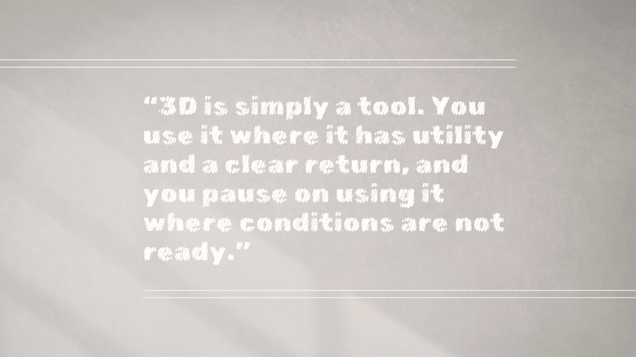 Rather than asking whether 3D should stretch further or be ringfenced, the more useful framing is to remember that 3D is simply a tool. You use it where it has utility and a clear return, and you pause on using it where conditions are not ready. Over time, as ROI increases, teams get more skilled, technologies become better integrated, and the broader environment strengthens, the relevance of 3D as a tool will naturally grow.